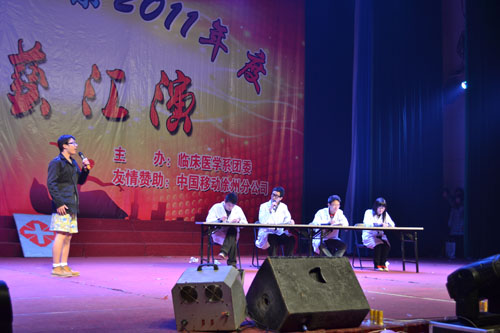 12月19日晚,由我校临床医学系团委主办的“徐州医学院临床医学系2011年度学生工作总结暨文艺汇演”在文体中心隆重举行。徐州医学院党委副书记高嘉玺、副院长郑葵阳以及各职能部门领导、各院系书记应邀出席大会,同时受邀的还有各院系学管办主任、团委书记、学生会主席等,他们同临床医学系全体同学共同观看了此次演出。