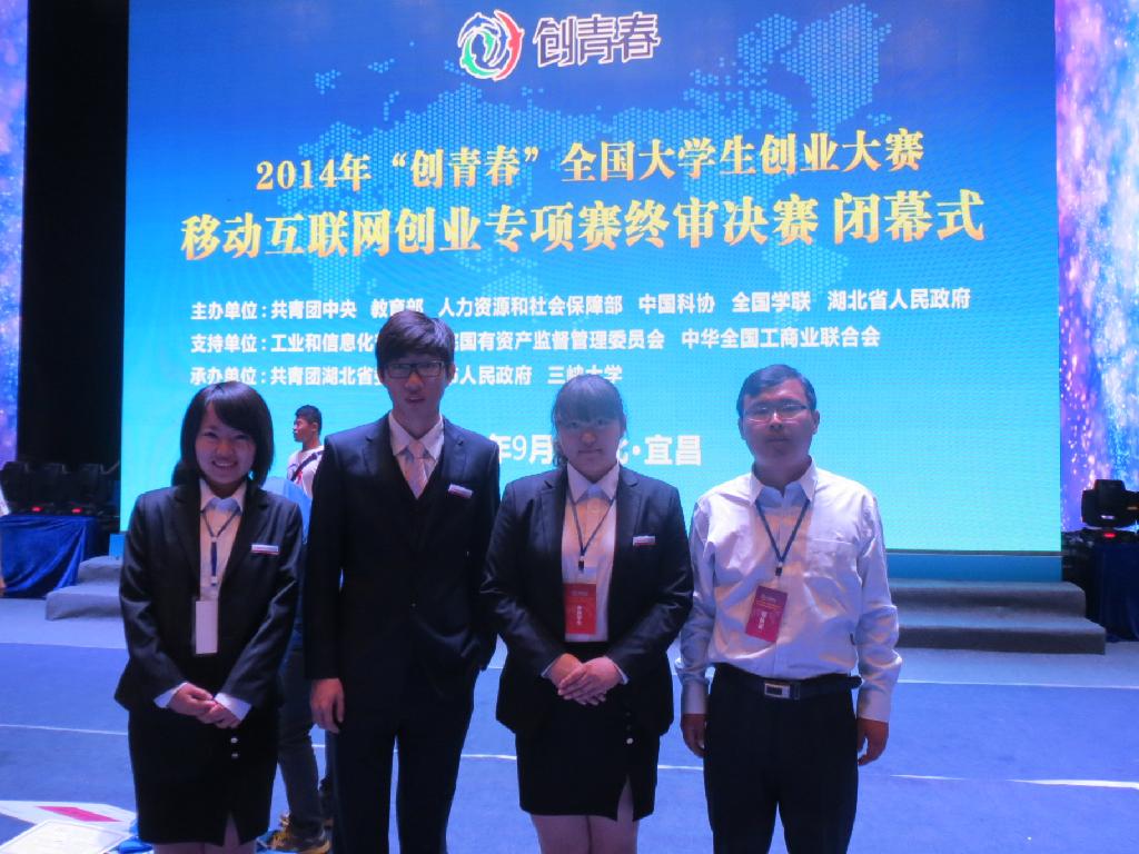 9月23-25日,由共青团中央、教育部、人社部、中国科协、全国学联和湖北省人民政府共同主办,工信部、国资委、全国工商联共同支持,共青团湖北省委、宜昌市人民政府、三峡大学联合承办的2014年“创青春”全国大学生创业大赛(原“挑战杯”全国大学生创业计划竞赛)移动互联网专项赛在湖北宜昌举行。由我校临床医学系刘嘉慧、王振林、胡潇逸、单晨、彭怡然,医学信息学院张弛同学组建的Ihealth 医疗科技项目团队荣获全国银奖,刷新了我校在“挑战杯”系列竞赛中的获奖等次记录。参赛过程中,主办方领导莅临我校项目展位与参赛同学进行深入交流,湖北卫视等媒体对我校项目进行了采访。