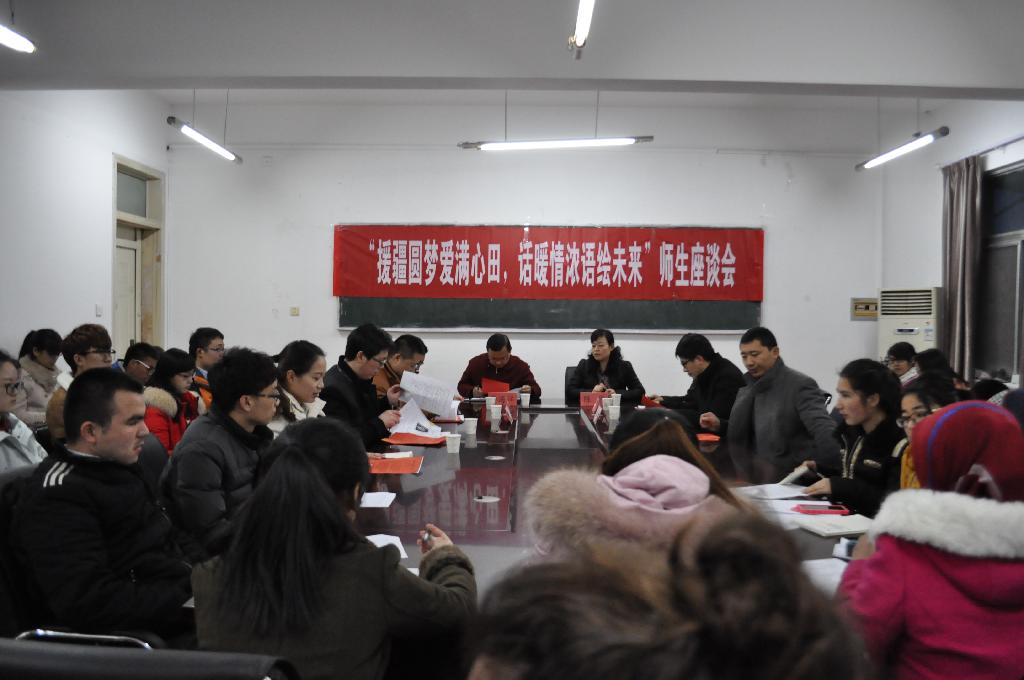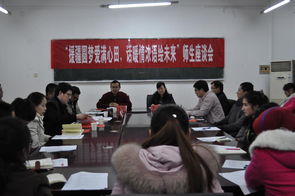 为了进一步拉近师生之间的距离,深入了解我校新疆学生的学习、生活和思想状况,解决学生面临的现实困难,为学生更好的成长成才保驾护航,临床医学系于2015年3月10日晚在系楼307会议室召开“援疆圆梦爱满心田,话暖情浓语绘未来”新疆学生座谈会。