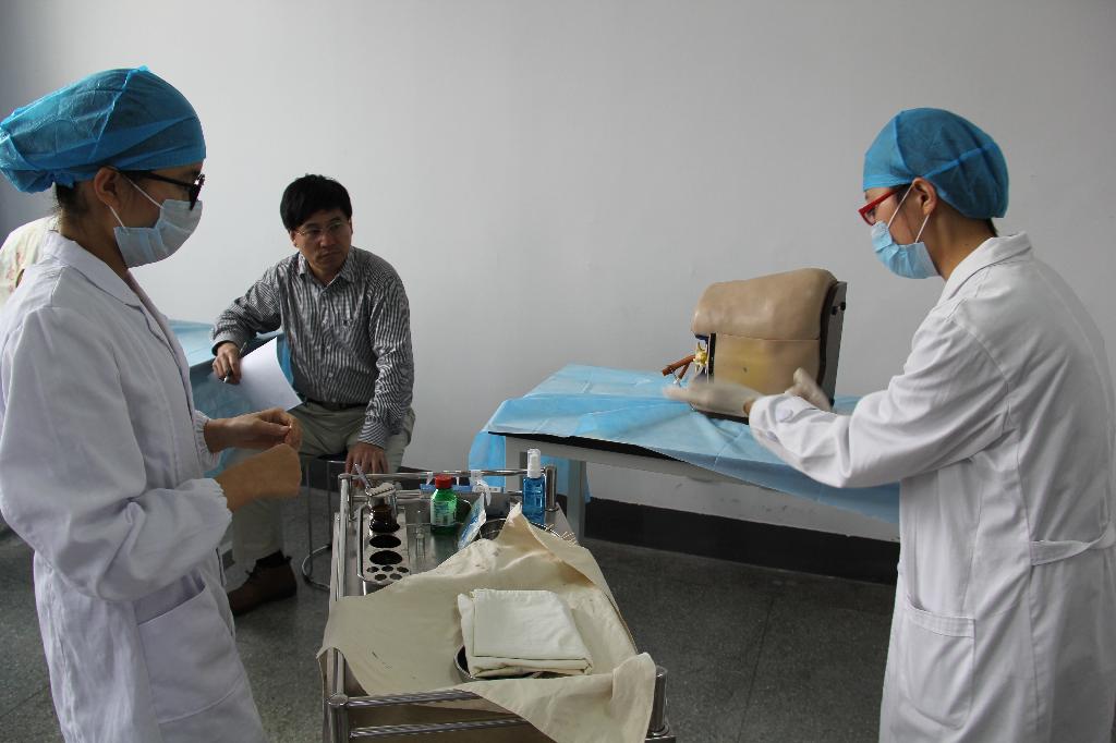 本次培训由我系2010级参加第六届全国高等医学院校大学生临床技能大赛华东赛区的选手担任实训指导,培训的内容为腰椎穿刺、消毒铺巾、心肺复苏以及四步触诊。他们以全国大赛的操作标准作为培训准则,先从操作的目的、禁忌、流程以及注意事项几个方面进行简单讲解,再利用操作模型进行示范性操作演示,然后学生分组练习,由指导一一纠错。为了解学生掌握情况,我系对接受培训的学生进行了一次技能考核,由各附属、教学医院的专科大夫作为监考老师。通过本次考核,考核老师表示学生操作能力有明显提高,个别同学达到毕业技能考核的要求。