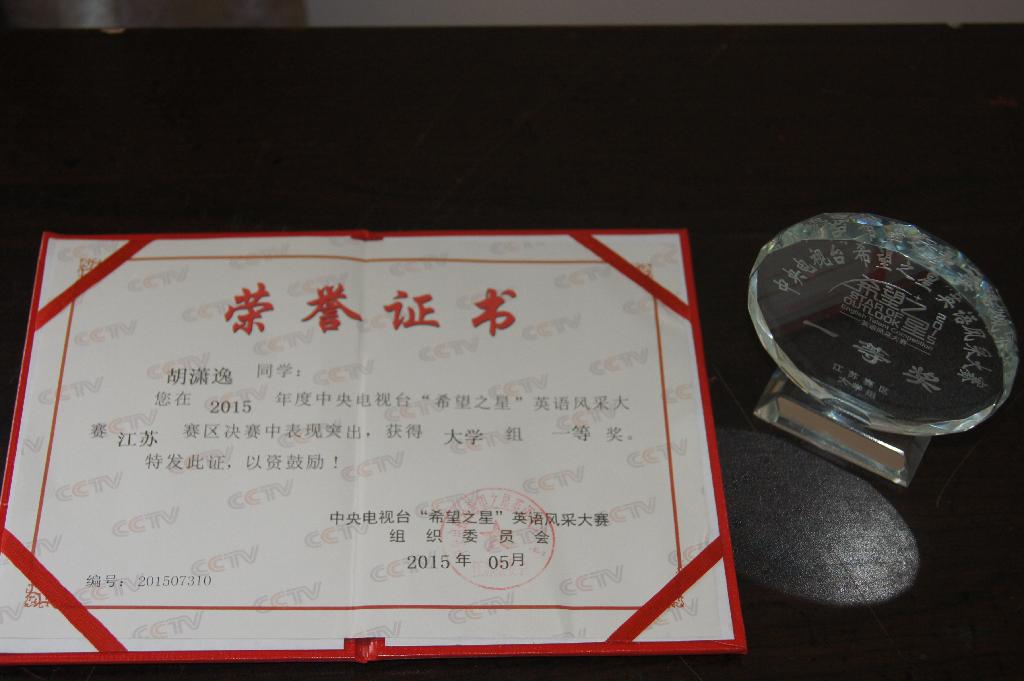 由中央电视台举办的“希望之星”英语风采大赛每年举行一次,比赛分为自我推介、话三论辩、一分钟打动评委团三个环节。比赛中,胡潇逸同学以其纯正的英语发音、机智从容的应答和丰富的舞台表现力赢得了大赛评委的高度认可,继徐州市赛区获得大学组一等奖后,再次于江苏赛区总决赛中高分斩获大学组一等奖,其指导老师我校临床医学系辅导员张敏也获得“江苏省优秀指导教师”称号。
