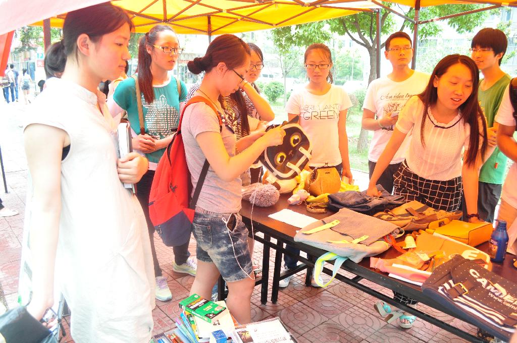 义卖活动中同学们纷纷拿出自己的书籍等学习用品、球拍等体育用品、太阳帽等生活用品,吸引了众多同学驻足挑选、购买,在自己有所收获的同时献出了爱心。