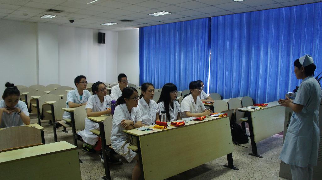 门诊部沈屹主任发表热情洋溢的讲话,表达了对志愿者的欢迎,并介绍了附院门诊部的概况。接着,护士长杜荣兰带领大家来到培训室,进行导医活动的讲解和培训,她详细地向大家讲解了作为导医志愿者的基本素质与职业道德,并亲自演示了导医服务礼仪要点及规范。随后,杜护士长带领大家熟悉了一遍门诊楼各个科室的位置并安排相关同学在各个楼层进行导医。