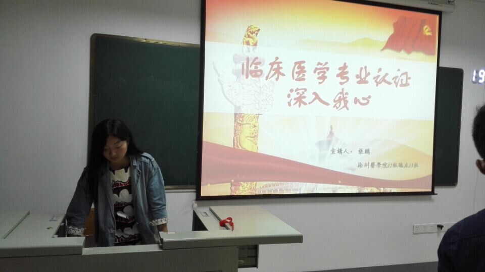10月22日晚临床医学系第三学生党支部微党课第四讲《临床医学专业认证知多少》在西校区第六小教室举行,临床医学系2012级第三学生党支部全体学生党员和预备党员参加。演讲由学生党员秦可主持。