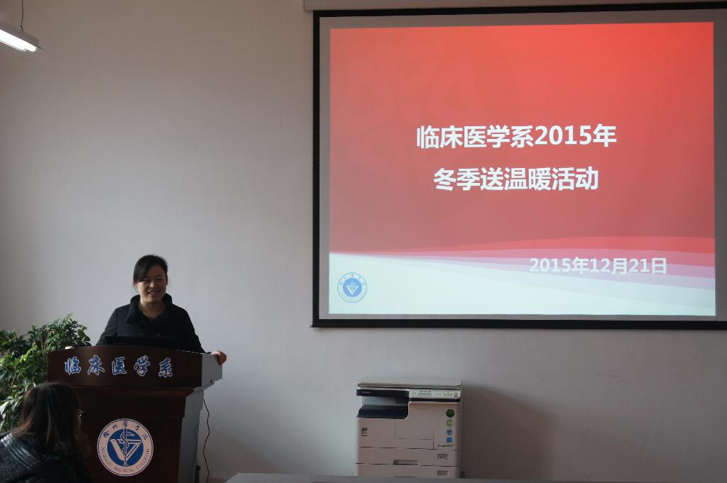 1-5年级辅导员老师通过严谨细致的调研,选出覆盖临床医学系所有班级116名家庭经济困难学生作为送温暖对象。临床医学系党委为了确保家庭经济困难学生的正常生活得到保障,为116名庭经济困难学生购买了保暖内衣。冬季送温暖活动包括三个环节。首先是相关老师为家庭经济困难学生代表送保暖内衣。第二是2014级学生代表宋胜男代表家庭经济困难学生发言。最后,临床医学系党委书记陈玮做总结性发言。陈玮书记对家庭经济困难学生代表说:“家庭经济困难只是暂时,希望同学们珍惜现在,通过现在的努力改变未来”。