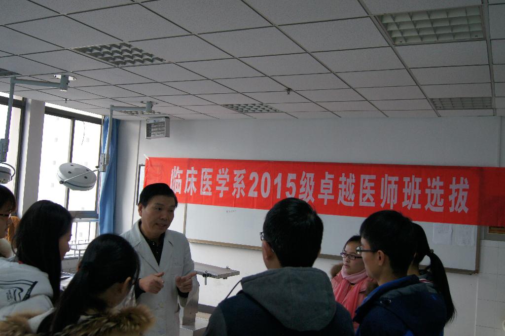 为做好卓越医师班选拔工作,临床医学系成立工作小组,从2015年12月开始动员到2016年1月10日进行选拔,前后历时近1个月。12月初,工作小组拟定出选拔办法,12月上旬进行卓越医师班组建动员,12月底通过体能测试、心理测评从报名学生中选拔出75名预选拔对象。2016年1月10日对预选拔对象进行现场考核,综合现场考核、学生综合测评成绩和现实表现,从74名预选拔对象中选拔出30人组建成一个卓越班。