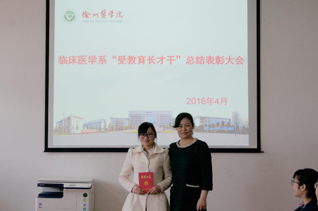 会上首先对2015-2016学年寒假大学生“ 受教育、长才干”实践活动中表现突出的先进集体和个人进行了4个批次的颁奖,盛苏皖老师为摄影组三等奖和实践报告组三等奖代表颁奖;宋言静老师为摄影组二等奖和实践报告组二等奖代表颁奖;姜嘉主任为摄影组一等奖和实践报告组一等奖代表颁奖;陈玮书记为摄影组优秀集体奖颁奖。2014级卓越医生班李巧丽同学代表摄影组优秀集体发言,她表达了对临床医学系的感谢,并珍惜荣誉,再接再厉。
