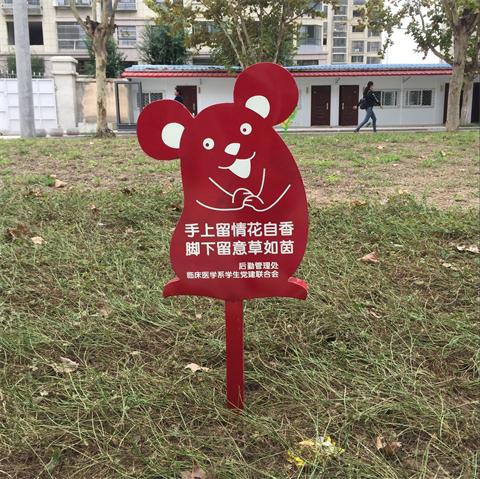几个月前,在这片空地上开展了春日栽花活动,师生齐心协力把它栽种成一片花海,芬芳馥郁的花海赢得了路过学生的一片赞美之词。走过春意盎然,走过夏花绚烂,这片花海迎来百花凋零的之际,借此机会,后勤管理处与临床医学系学生党建联合会二度携手,在花海树起环保标语牌。制作环保标语牌时,主办方广泛征集了各方意见,最终择出几句温馨而不失警示作用的标语,并设计出各种可爱的卡通图像作为标语牌的背景。活动当天,同学们举着标语牌,努力避开花茎叶,小心翼翼地走到花丛里,挖出一个个土坑,把标语牌朝各个方向树立好。