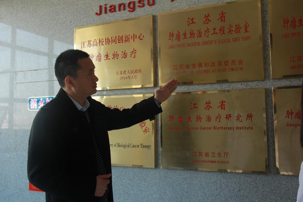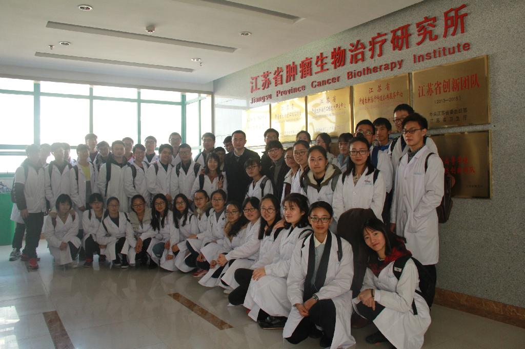 11月12日,临床医学系兼职班主任刘岩老师带领2015级临床7班全体学生前往西校区江苏省肿瘤生物治疗研究所参观。