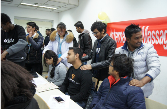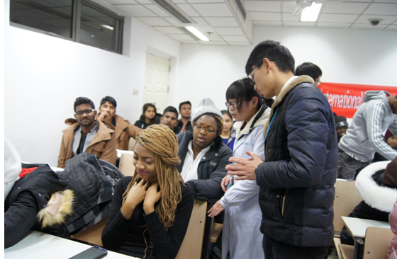 朱春梅院长首先发表致辞并与全场同学拍照留念。随后副社助理成虎介绍了内涵丰富的中医文化及推拿手法步骤,并由技术部助理袁雷做现场演示。现场留学生反应热烈,热爱之情溢于言表。他们认真听讲、相互讨论并相互练习推拿技术,滚法,一指禅等随处可见。活动过程中很多留学生主动找推拿社成员请求教授推拿技巧并互加好友,希望以后能深入讨论学习推拿技术,虽沟通有些不便但不能妨碍他们学习推拿的热情。
