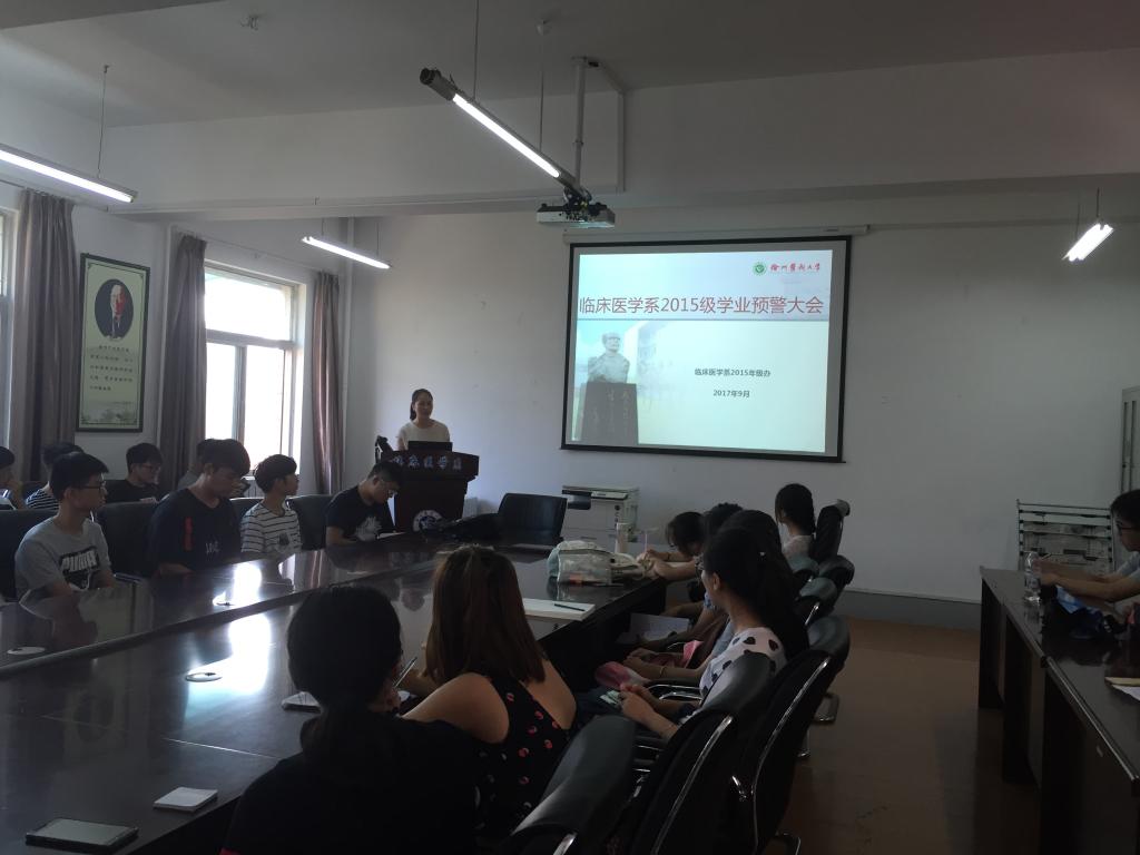 为进一步加强学风建设和对学生的学业管理,及时对学生专业学习进行跟踪,有效预防学生因学业问题带来的矛盾和困惑,使每一位大学生顺利完成学业,成长为优秀的医学人才,根据《徐州医科大学临床医学系本科生学业预警机制(试行)》的相关工作要求,9月14日,2015级年级办召开学业预警大会,对年级学生学位绩点低于2.0的同学进行第一批次的预警、引导。