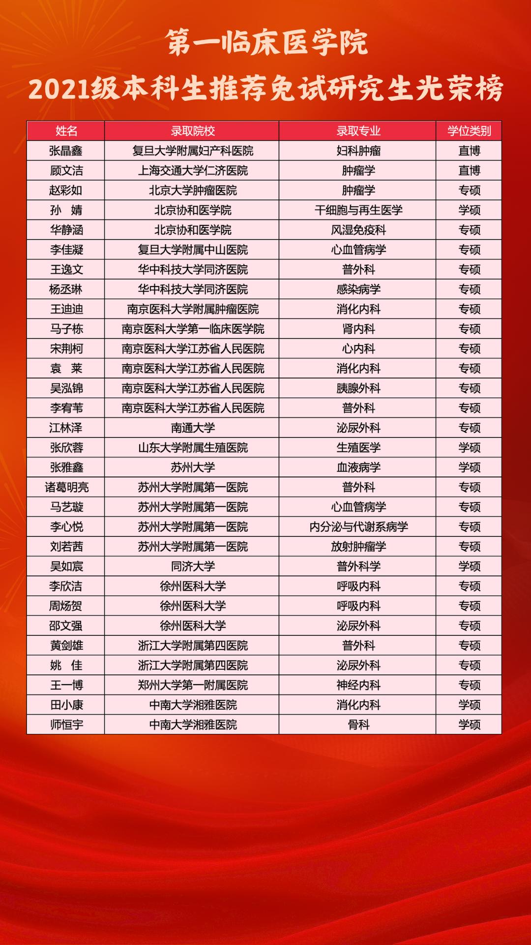捷报如光,点亮金秋!在2026届推免中,第一临床医学院2021级本科生以梦想为帆,以汗水为桨,不负韶华,不负热爱,终迎硕果盈枝!30名学生成功迈入更高学府,继续探索医学奥秘!