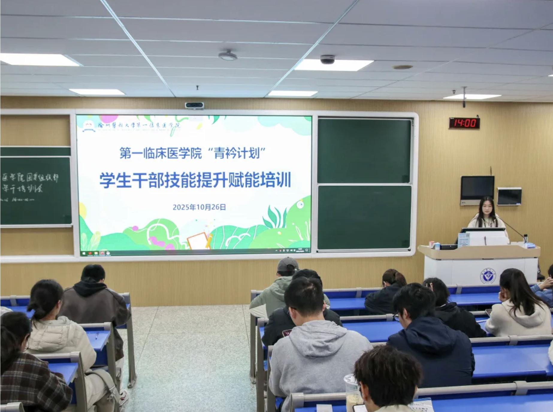 为进一步提升学生干部综合素质,推动学生工作规范化、高效化开展,近日,第一临床医学院在主楼B202教室举办“青衿计划”学生干部技能提升赋能培训会。学院全体团属学生组织干部和2025级本科班长、团支书参加本次培训。